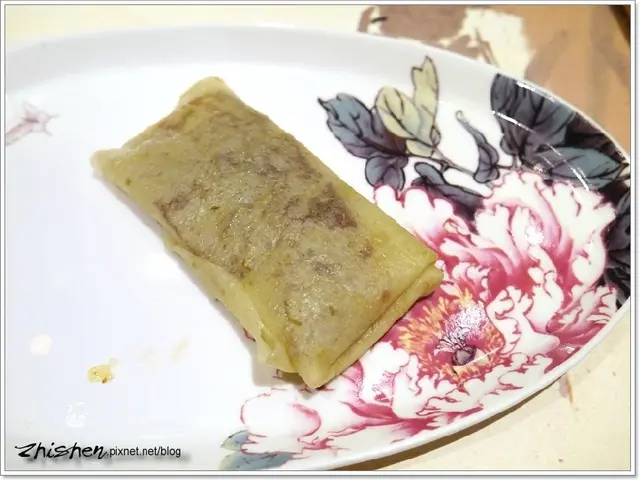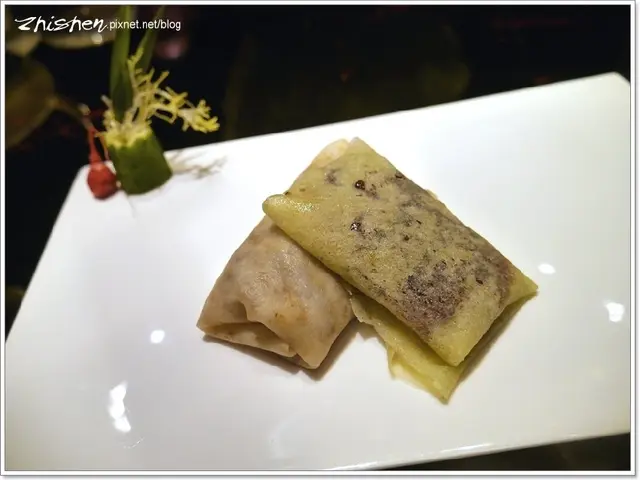 Ω一是胚芽荷葉餅包入片皮鴨、炸過的莫札瑞拉起司條、生菜、及桂花醬,口感爽脆又有異國風味~