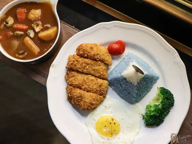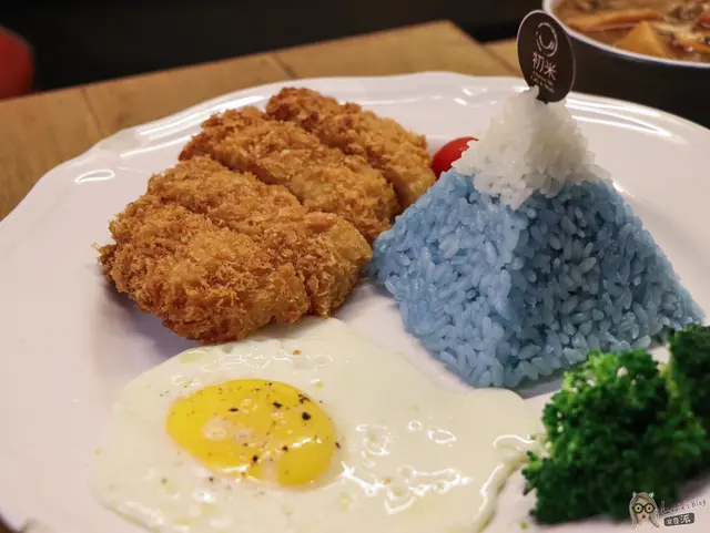 看菜單就被這個可愛的富士山吸引了,雖然豬排飯是很常見的簡餐料理,但『初米咖啡』別出心裁的給他另外一種詮釋方式,也挺吸睛。藍色的米飯是蝶豆花的天然色素,看起來美美der~不吃飯的小朋友也可以騙他一口一口吃光光吧XD