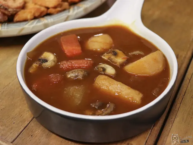 咖哩醬比較稀一點,有點偏甜,很家常的口味,裡面用料很豐盛,胡蘿蔔與馬鈴薯都hen大塊。
