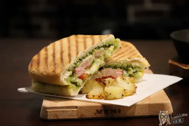 帕尼尼分量挺不小,一個女生絕對可以當正餐吃。部落客的宿命就是永遠只能吃冷食物,每次拍完照餐點都不燙口啦。但厲害的是,即便我真的拍非常非常久,這帕尼尼的皮咬下去還是非常脆!! 裡面塗滿青醬,培根很厚但吃起來不油膩,還有起司與一些蔬菜丁,口感豐富調味剛剛好,感覺很沒負擔口味卻不平淡。