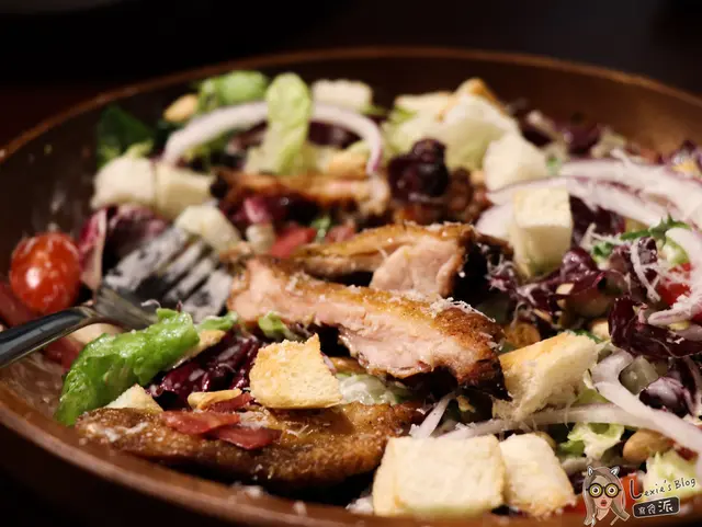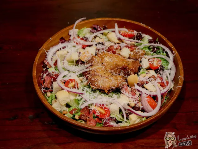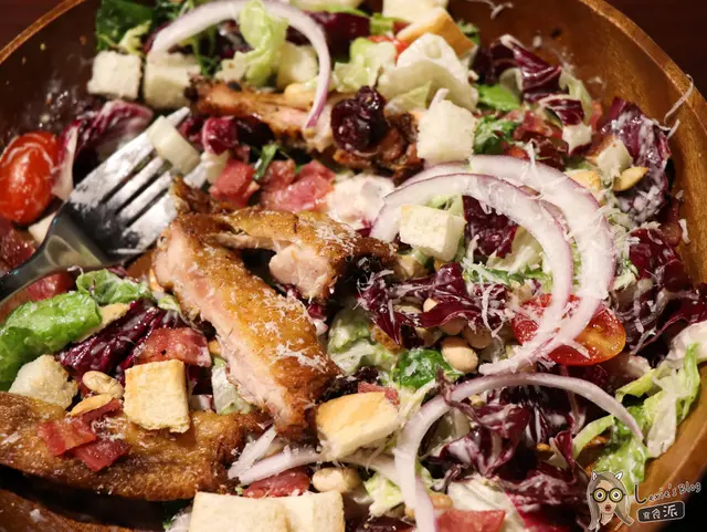 超級豐富的沙拉,不僅分量好大,裡面的種類也好豐富,這一盆也可以當我的正餐了!除了蘿蔓生菜、紫生菜(孩子們你們知道這兩種生菜都超貴的嗎?),還有番茄、洋蔥、更有增添口感的黃豆、南瓜子、麵包丁等,配上鹹度較高的凱薩醬上面刨上起司粉,讓不喜歡吃菜的人也可以一口一口吃光光!無骨雞腿排醃的很入味但好像有點烤過頭了點,我覺得肉質偏乾,皮比較硬一點。不過瑕不掩瑜,這個沙拉是我跟豐滿哥今天都最愛的一道菜,非常推薦。