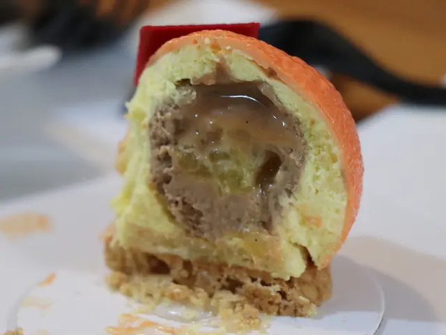 外皮是巧克力,中間的金桔慕斯清爽討喜,倒是咖啡巧克力奶酪我吃不出巧克力與咖啡味,是個中層的調劑但又覺得可有可無,中心香橙鳳梨果醬有著比較明顯的酸度,最底層的香橙沙布列非常好吃,酥脆可口又帶香氣,整體甜度不高,如果平常不吃太甜,這個應該滿討喜。但相較於上次吃的 無二法式甜點的 柑 ,我比較喜歡無二的,層次更鮮明,尤其葡萄柚的酸苦味很跳,正中我心。