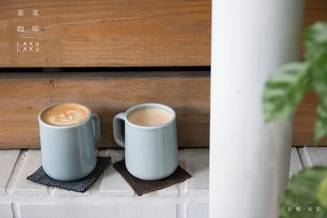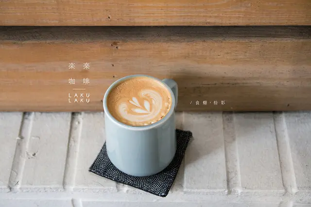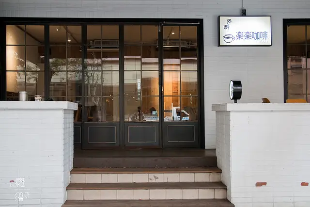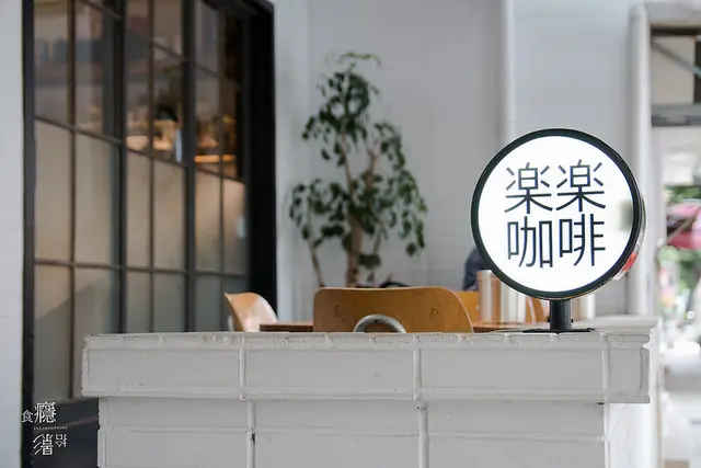 店面是很清新簡約的白色磚牆,「楽楽咖啡」黑粗體字看來很可愛、溫馨。