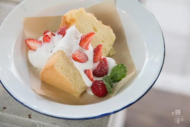 最後則是酸味最誘人的草莓戚風,和訂購時整膜的蛋糕不同,切片戚風是另外再淋上鮮奶油與草莓的。