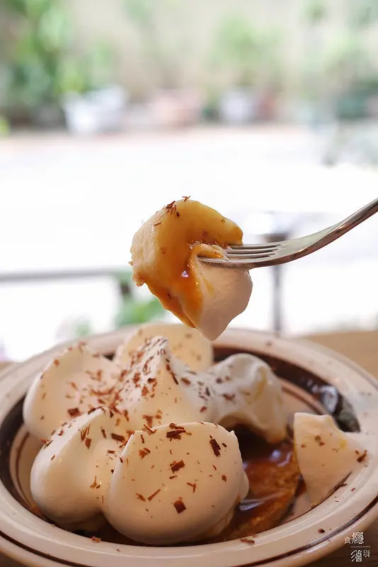 看到時其實我有些卻步,不過嚐了ㄧ口就放心許多,因為他們的鮮奶油真的不會過於甜膩▲將其中的香蕉與塔皮挖起,與奶油一同入口