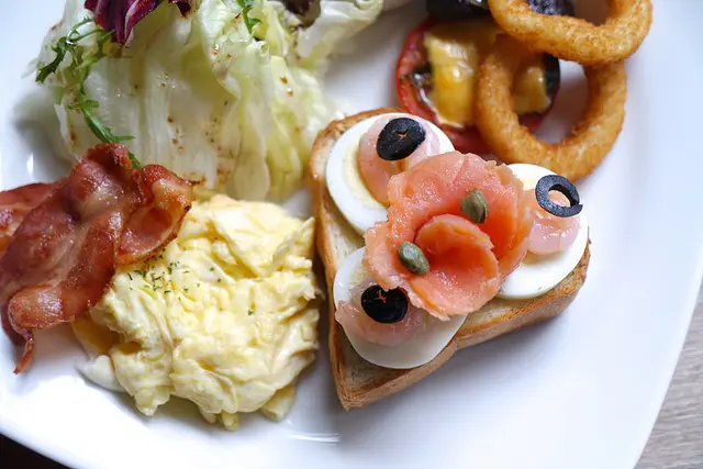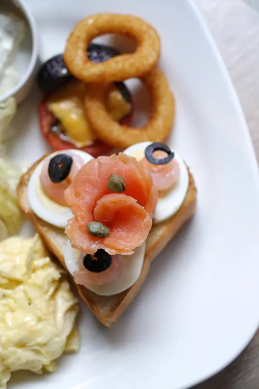 且擺盤也毫不馬虎,這個愛心造型的吐司佐燻鮭魚、水煮蛋是不是超可愛!
