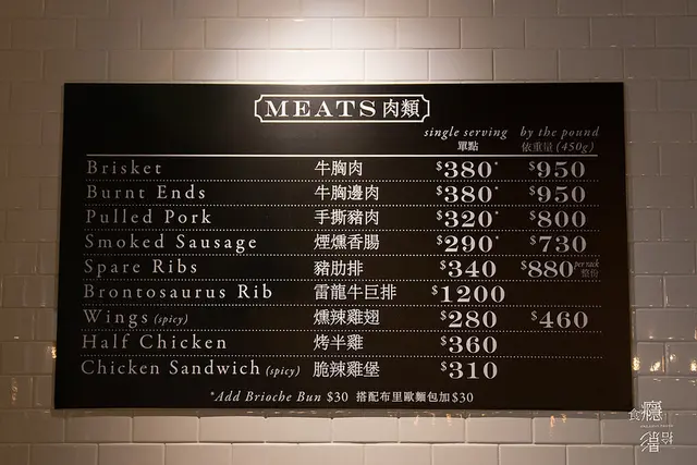 燻辣雞翅 wings(spicy)、牛胸肉 brisket、手撕豬肉 pulled pork、豬肋排 spare ribs