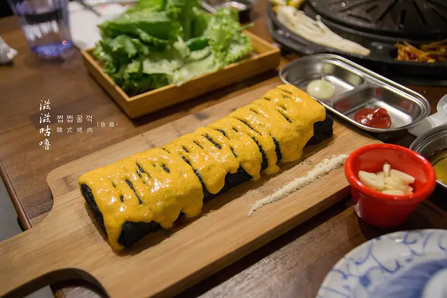 建議可以沾滋滋咕嚕的獨門醬料品嚐,酸酸的醬汁還蠻清爽,另外搭配泡菜及生菜也不錯吃!