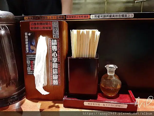 衛生紙盒上還有店家的告示「請用心想用這碗麵」