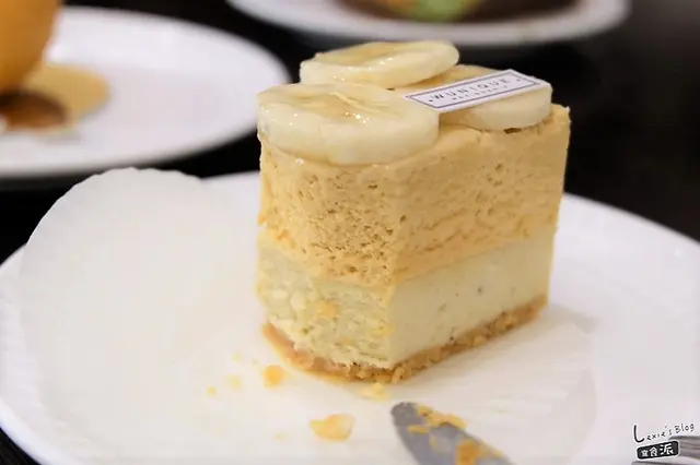 最上面有香焦,上半是太妃糖幕斯,濃郁的甜香味很迷人,組織比較蓬鬆,也有檸檬的味道(必須稱讚一下『無二法式甜點』的甜點,幕斯都做得好棒)。下面是也是類似幕斯口感但稍微緊實ㄧ些,服務生說是香蕉乳酪蛋糕慢烤兩小時做出來的。這道甜點也人氣很高因為我們到沒多久就賣光了。但這顆我覺得是今天最普通。