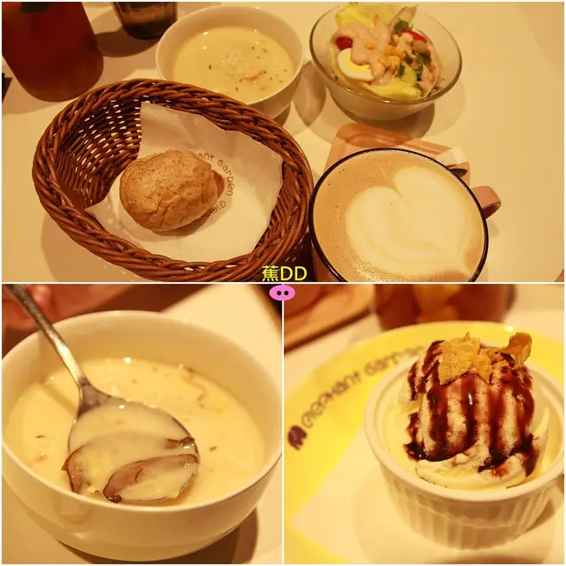 前餐送來時噗爸去拍照,所以照片的麵包已經被阿噗解決一些了(一直吵著要吃),濃湯與熱拿鐵都很對噗家的味口,當初點熱拿鐵時,噗媽只是隨口問說拿鐵拉花會有大象嗎,服務的先生說有,結果送來的時候是拉愛心的花,噗媽心想可能是沒聽清楚,結果那位服務員特別又送一杯有拉著大象花的拿鐵來,說這是因為剛剛的疏忽招待的,超值的服務真是大大加分,後來得知這位是店長,還真是榮幸讓店長來親自服務呢。