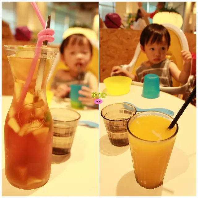 ▼『旋轉大象嘉年華』提供的飲料一杯為水果茶好喝,另一杯柳橙汁為套餐提供