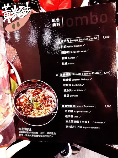 牛肉組合、生猛活力、海鮮總匯、豪華拼盤、蕈菇鍋、蔬食鍋等。