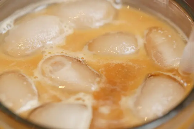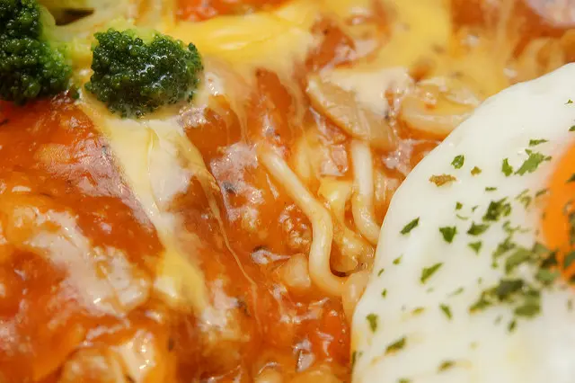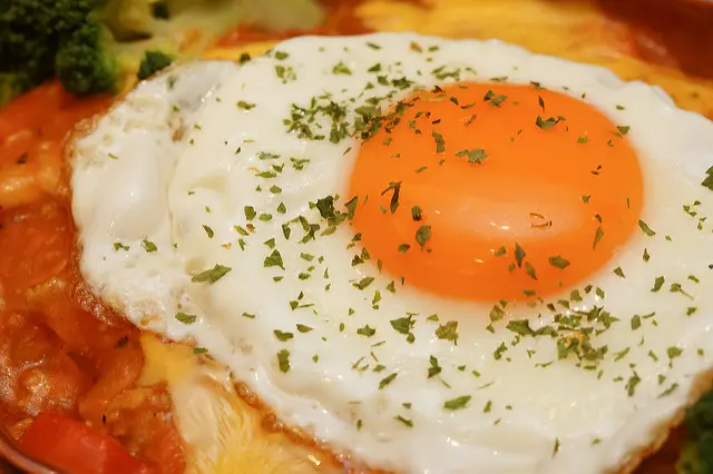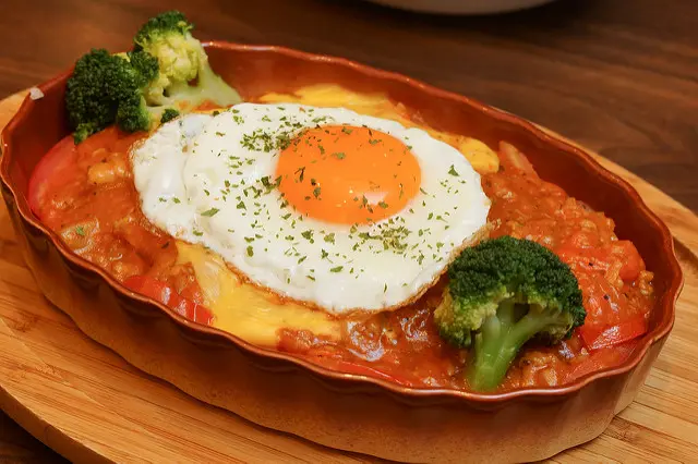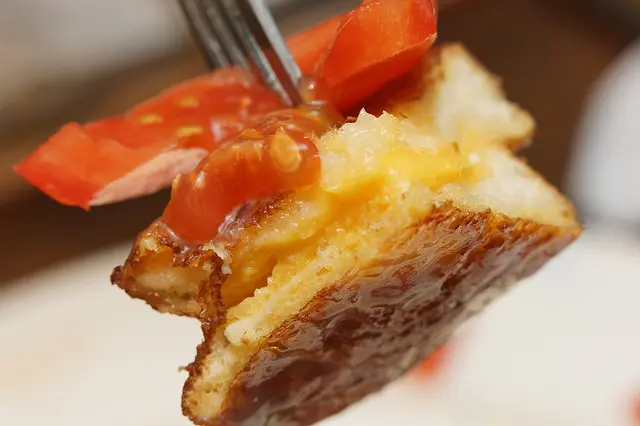 半熟蛋下方 鋪上了一片起司 隨著溫度慢慢融化牽絲