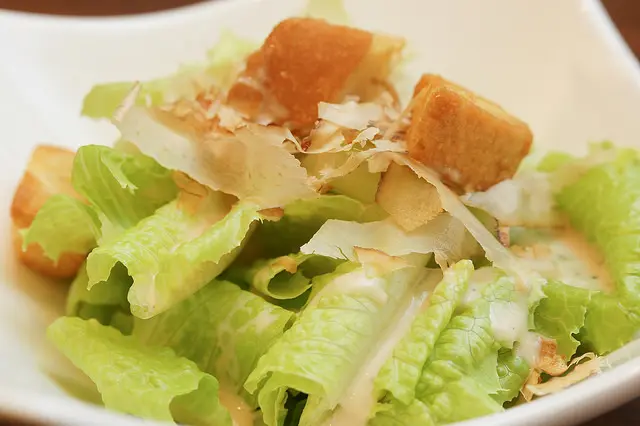 灑上柴魚片的生菜沙拉 佐以特製凱薩醬 加入些許黃芥末 口味不只鹹甜還有點酸勁