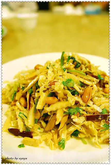 以切絲的高麗菜、豆干、香菜、花生米,加上醋和麻油涼拌