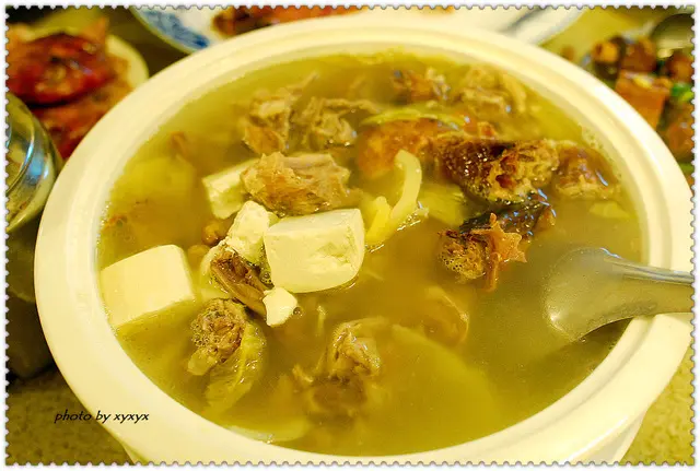 湯裡有鴨架、酸菜、嫩豆腐、粉絲