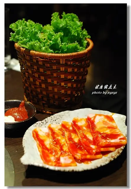 這道為5大片豬五花、生菜、味噌醬和蒜片所組成。