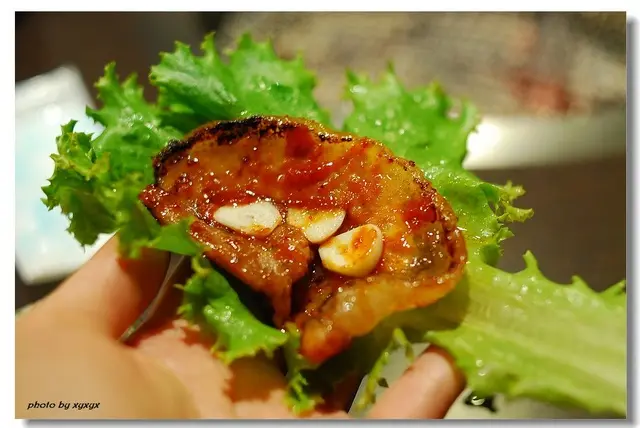 正確的吃法是在生菜上塗味噌醬,再放一片烤好的豬五花,最後再放上蒜片,