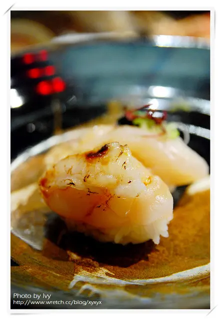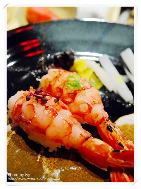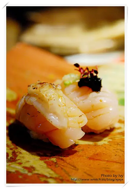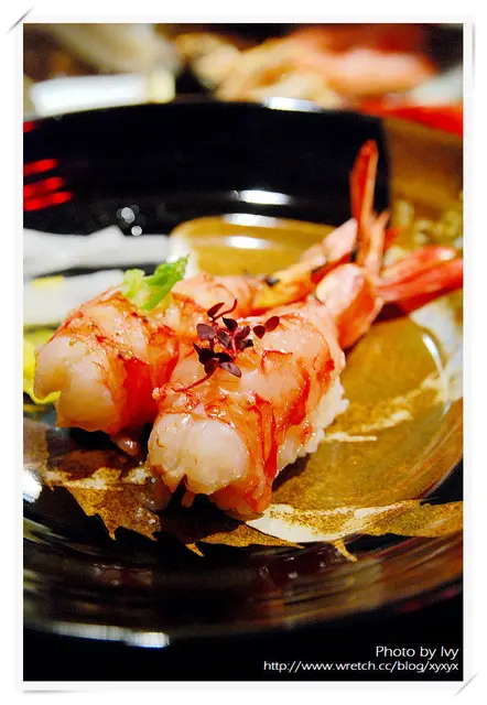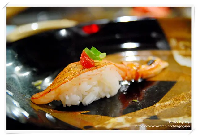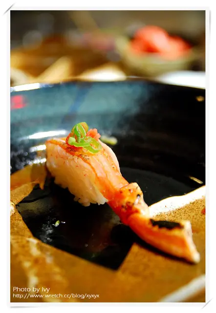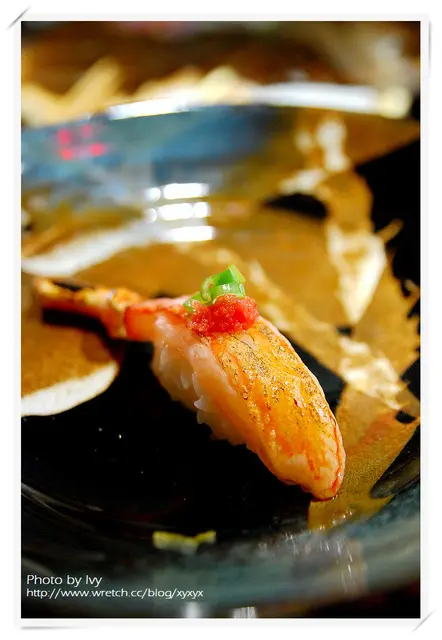其中一貫胭脂蝦佐以四季紅,另一貫胭脂蝦則是微炙後佐宜蘭蔥