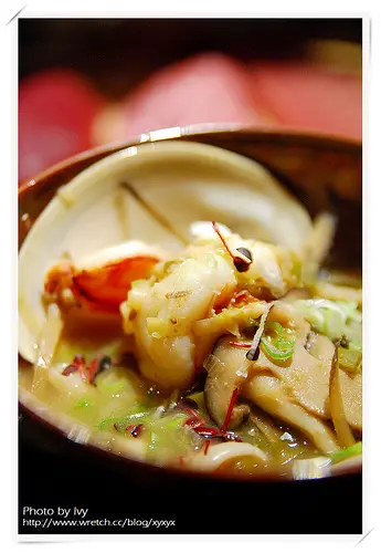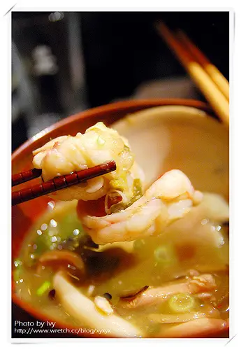 湯裡除了蝦母、大蛤蜊之外,還有牛蒡、菇、宜蘭蔥