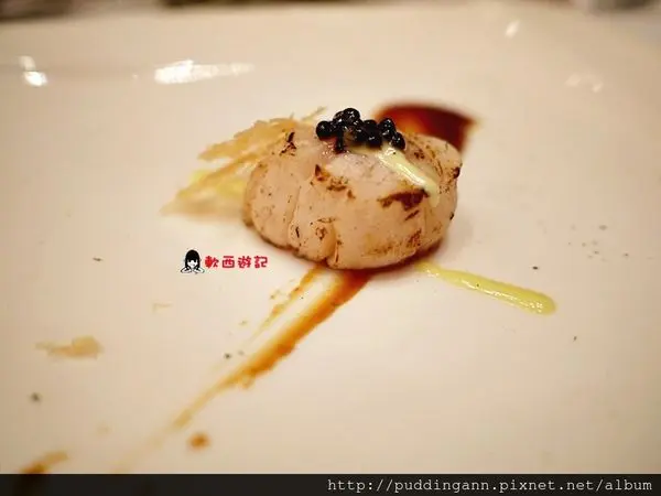 下面是龍蝦醬,佐著帕瑪森起司,上面黑黑的一點點是醬油球,壓破可配上美乃滋和干貝一起入口