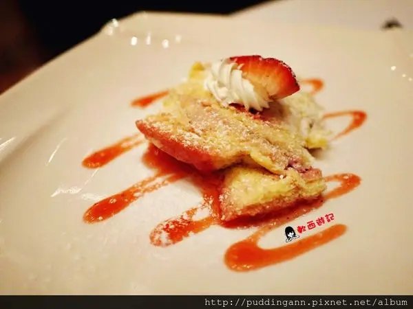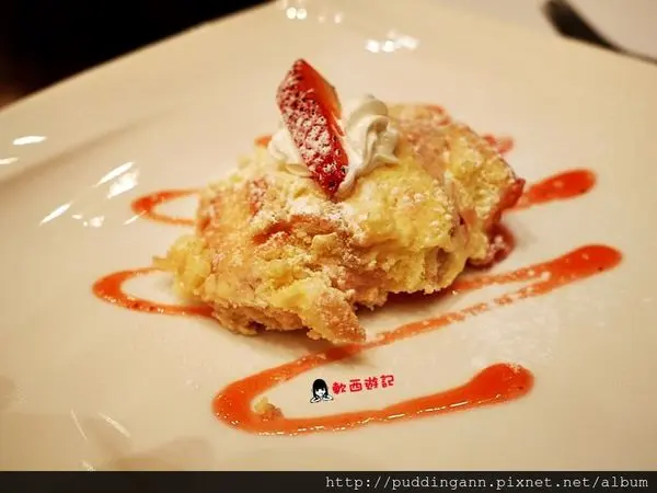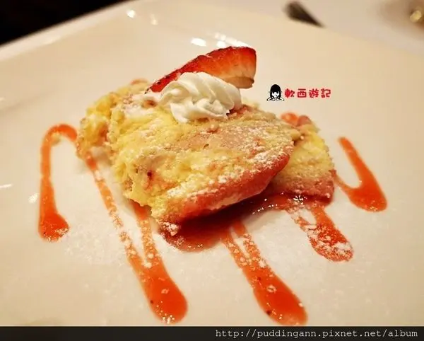 形狀是不規則的,像蛋糕但是比較紮實,上方灑著糖粉和新鮮草莓點綴~好的一餐要有完美甜點收尾!