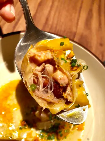 使用餛飩皮做成麵餃,裡面包以塊狀的鴨肝~
