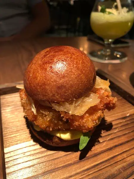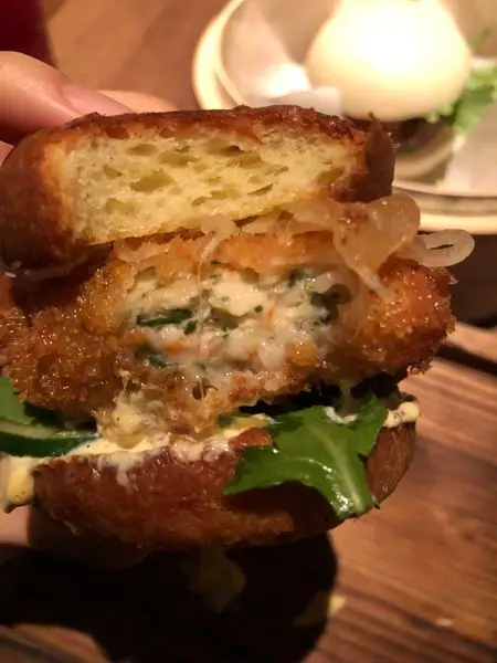 烤得酥香的奶油漢堡麵包,夾入炸得酥脆多汁的炸蝦餅,佐以特色塔塔醬、醃漬洋蔥、芝麻葉