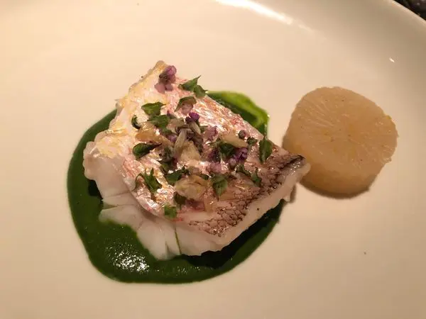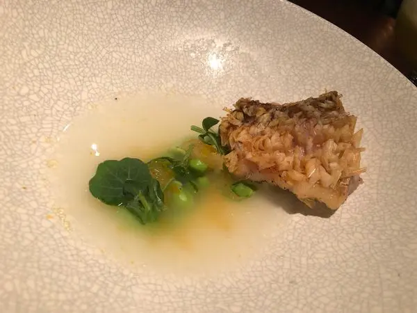 $1880 套餐的馬頭魚,魚鱗經過酥炸,魚煎的比較有味道,搭配青豆泥和微酸的湯汁