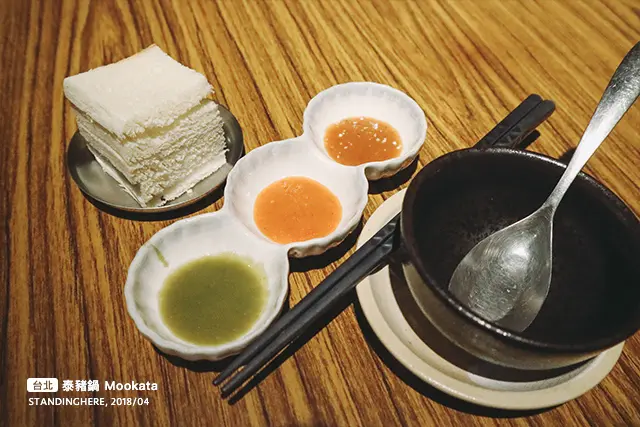 中間橘色是以豆腐乳製作的泰國甜辣醬,適合沾肉,