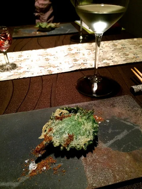 香炸紫蘇包馬糞海膽佐玉米泥,撒以海鹽和炸蔥粉