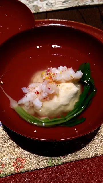 這款清湯,裡面是一隻明蝦撒以金箔,底下是淡黃色的丸子: 真丈