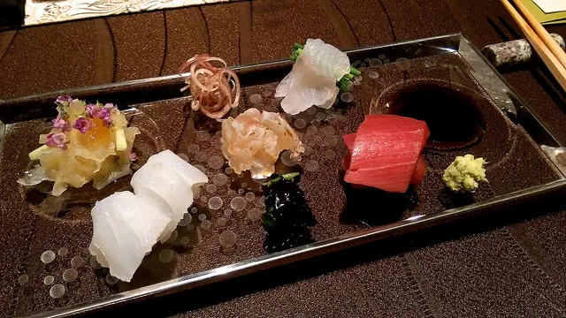 由左至右依序是: 開胃用的白木耳搭紫蘇花、烏賊、轉換味覺用的蘋果絲、炙燒龍蝦、青衣、大間黑鮪魚