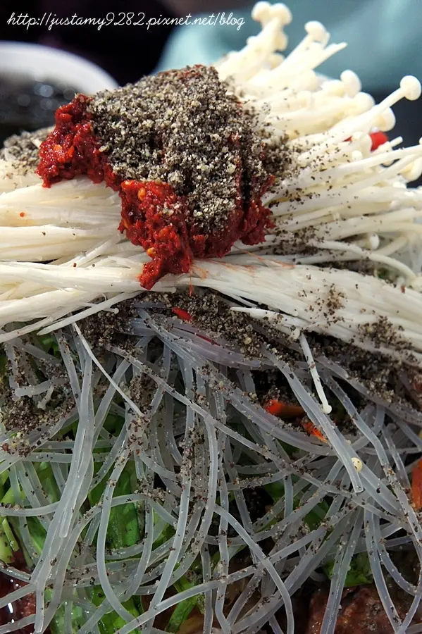 上頭堆了滿滿的青菜、豆芽、粉絲、金針菇及佐料