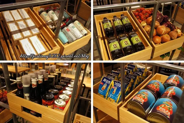 裏頭的佐料有:火腿、義式香腸、炙燒培根、焦糖洋蔥、瑞士乳酪&芝麻葉