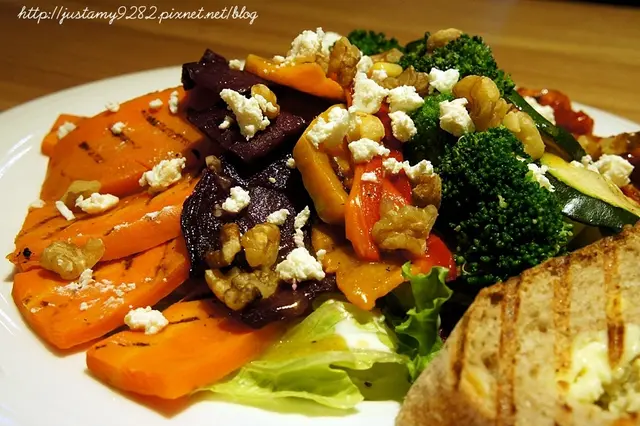 裡頭放有:綜合四蔬、烤胡蘿蔔、甜菜跟、櫛瓜、南瓜、費達乳酪、核桃