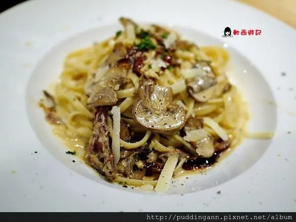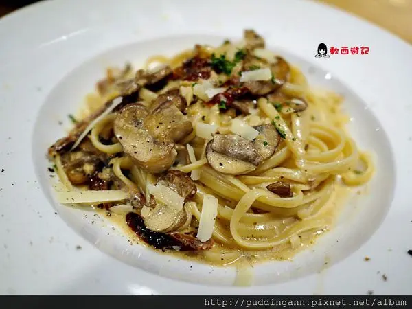 麵吃起來Q彈有勁,上面有磨菇、曬乾番茄跟大蒜,吃起來味道比較重但又不失豐富口感好好吃