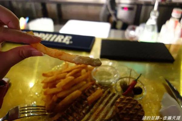旁邊搭配薯條的沾醬,不是常見的番茄醬,而是檸檬酸豆美乃滋。