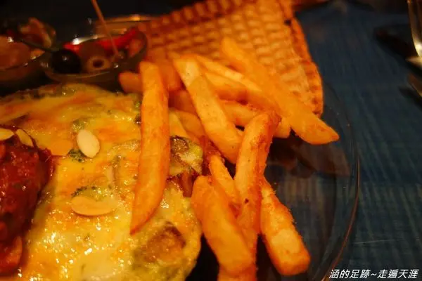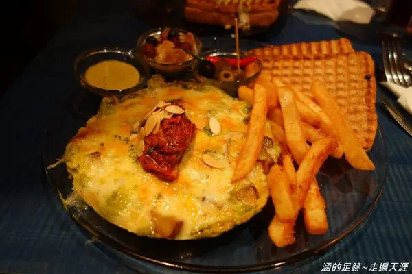 烘蛋上是厚厚一層帕馬森起司,最上面是番茄做的醬與杏仁片。