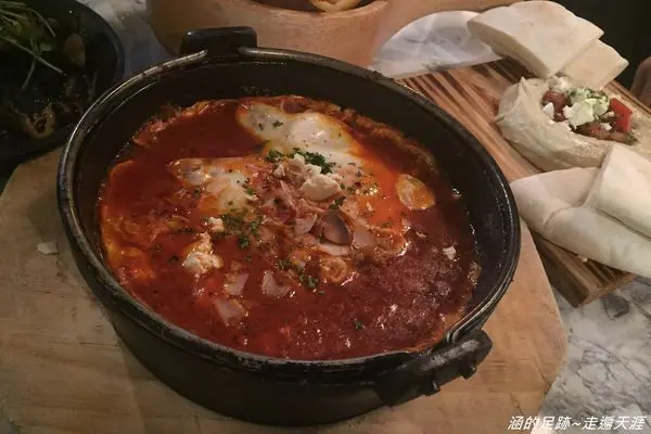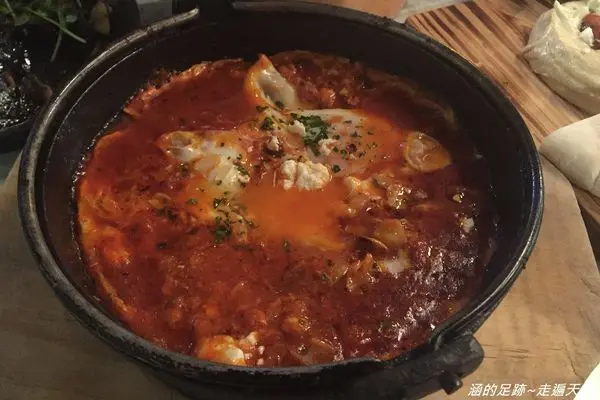 夏卡蘇卡就是小涵一直心心念念想吃看看的料理! 所謂的夏卡蘇卡是一道番茄水波蛋料理,以新鮮番茄、炒洋蔥、辣椒等加上小茴香等阿拉伯香料調味而成,是中東地區相當受歡迎的一道料理。這在台灣很少見,所以小涵一直想吃看看。