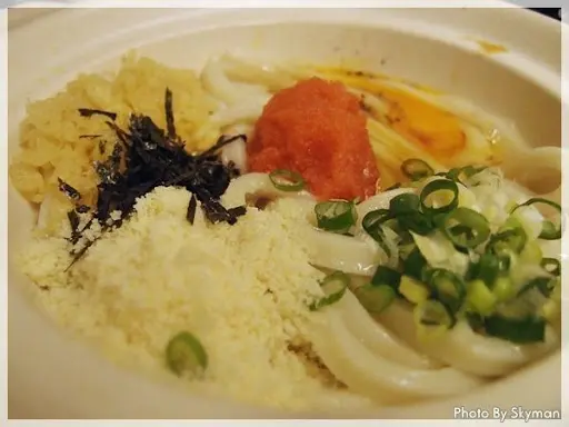 起司明太子烏龍拌麵,這應該算是豪華版的吧?我印象中料理東西軍介紹時,日本人都只加醬油、蔥花、蛋黃就吃到天上去了,這裡的還有加起司粉、明太子之類的配料,太豪華了><