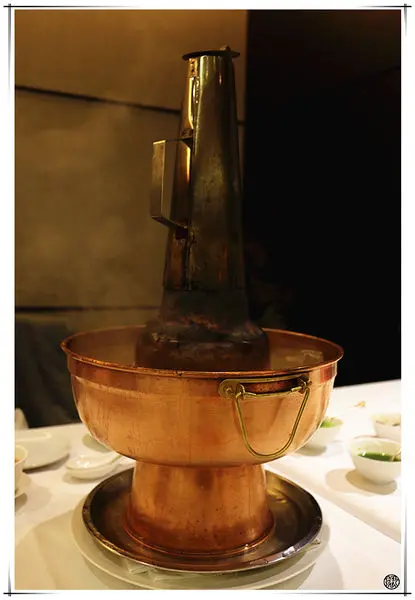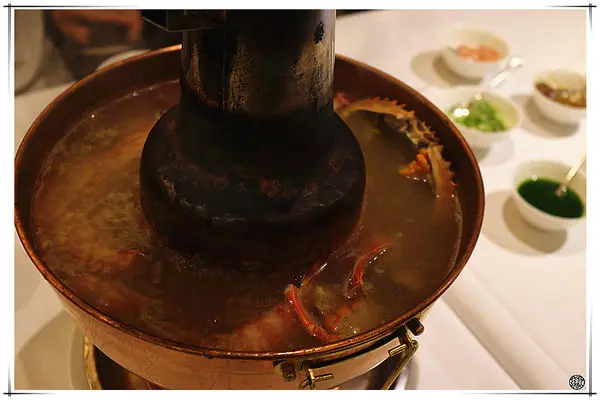 火鍋以菊花入菜,搭配當季食材熬煮烹調,首先先以海鮮下鍋,增添風味。頤園以老北京傳統方式在爐子裡放火紅的煤炭,而非使用瓦斯或電磁爐,據說這樣煮熟的食材會更好吃。