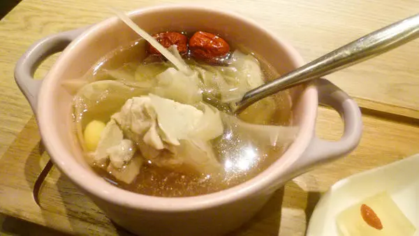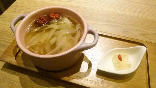 牛蒡雞湯。幾塊雞胸肉、紅棗、大把牛蒡,湯不油膩極為暖胃。