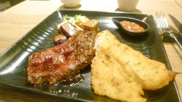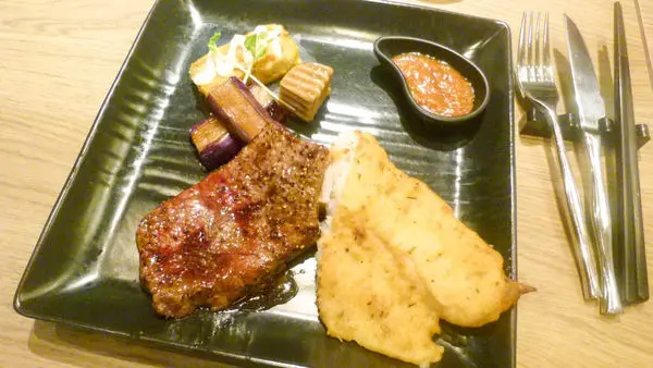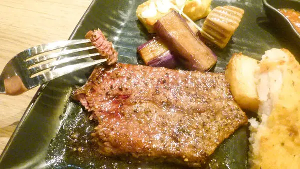 牛肉七分熟,帶有血水,中間有筋,其餘柔軟好咬,單吃就美味,不過也可以沾食蘑菇醬或是黑胡椒醬。