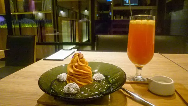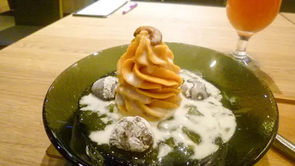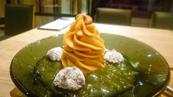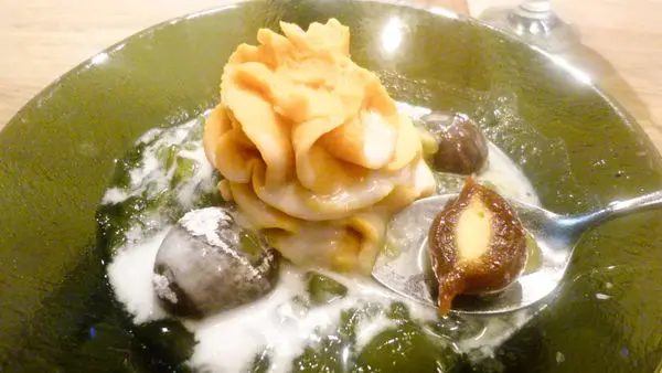 清爽的綠茶凍包圍了看似冰淇淋的地瓜泥,上頭還擺一顆堅果。