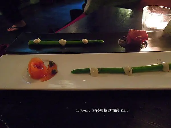 黑色盤子的是蘆筍牛肉;白色盤子的是蘆筍鮭魚捲。