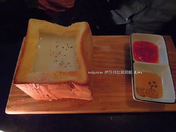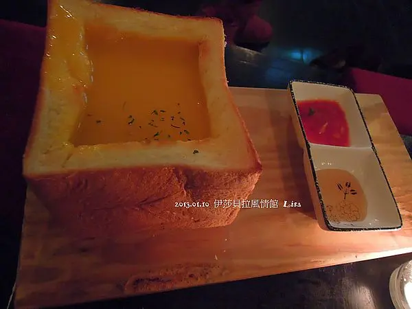 其實湯一上桌的時候我有點傻眼,這裡足足有半條土司阿!我想這裡同時也響應了環保吧,喝完湯還可以把容器吃掉,連洗碗都不用XD。旁邊的兩個蘸醬,紅色的是泰式蘸醬;黃色的是蜂蜜。