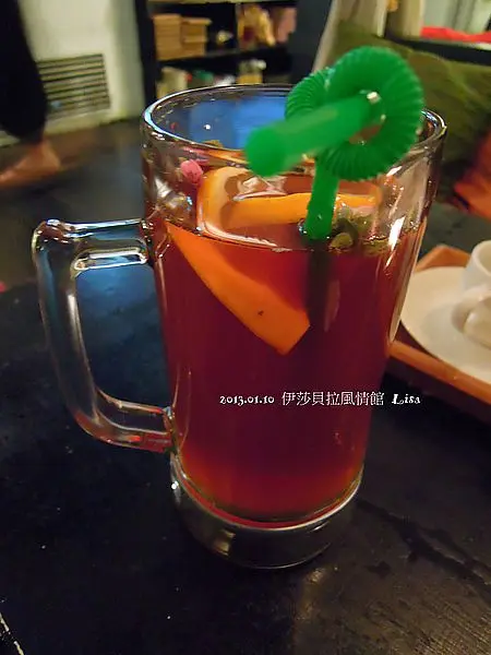 右邊的是我點的 - 水果甜酒,上面薄薄的一層是紅酒,底下是柳橙,首先會感覺到紅酒微澀的口感,緊接著是柳橙的甜味,我覺得這一杯超好喝的!當下有種很想續杯的感覺XD
