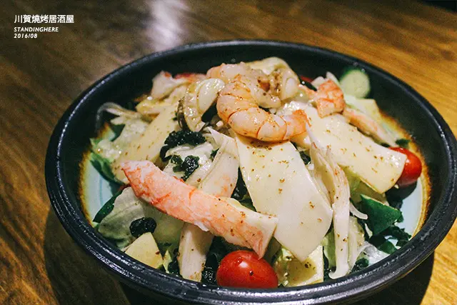蟳味棒、蝦仁、鮑魚片、干貝、生菜、海帶芽、蕃茄和小黃瓜等等,